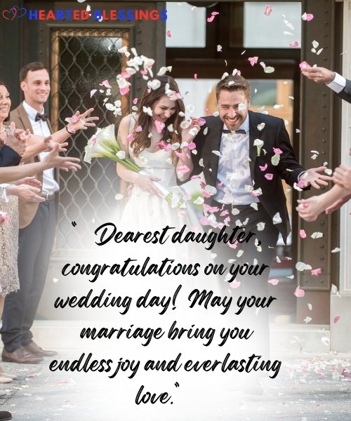 - “Dearest daughter, congratulations on your wedding day! May your marriage bring you endless joy and everlasting love.”