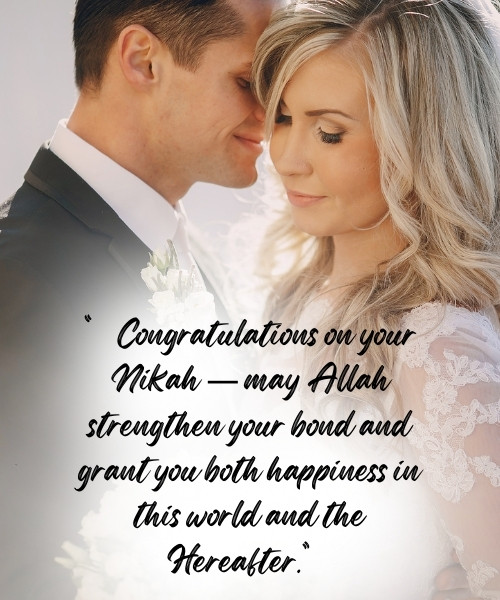 - “Congratulations on your Nikah — may Allah strengthen your bond and grant you both happiness in this world and the Hereafter.”