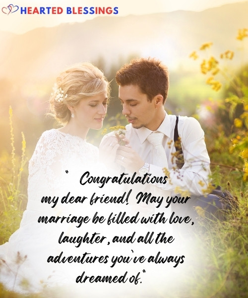 - “Congratulations, my dear friend! May your marriage be filled with love, laughter, and all the adventures you’ve always dreamed of.”