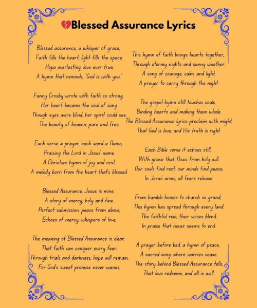 From Fanny Crosby’s pen to generations of believers, the Blessed Assurance lyrics have become a beacon of comfort and devotion. This gospel hymn remains a timeless song of joy, faith, and assurance — a melody of the soul that keeps hope alive and hearts lifted toward heaven.