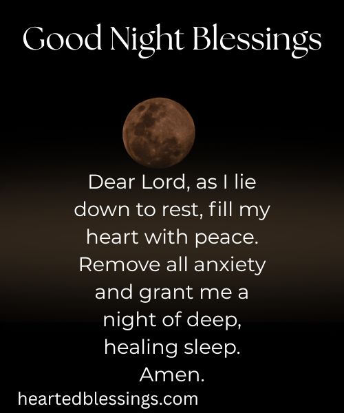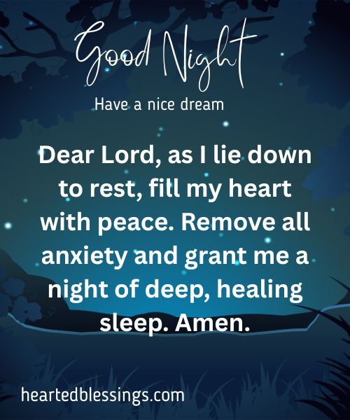 “Dear Lord, as I lie down to rest, fill my heart with peace. Remove all anxiety and grant me a night of deep, healing sleep. Amen.”